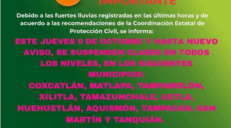 Debido a las fuertes lluvias registradas en las últimas horas y por recomendación de la Coordinación Estatal de Protección Civil (CEPC), la Secretaría de Educación del Gobierno del Estado (SEGE) informa que se suspenden clases este jueves 9 de octubre y hasta nuevo aviso en los municipios: Coxcatlán, Matlapa, Tampamolón, Xilitla, Tamazunchale, Axtla de Terrazas y Huehuetlán.
