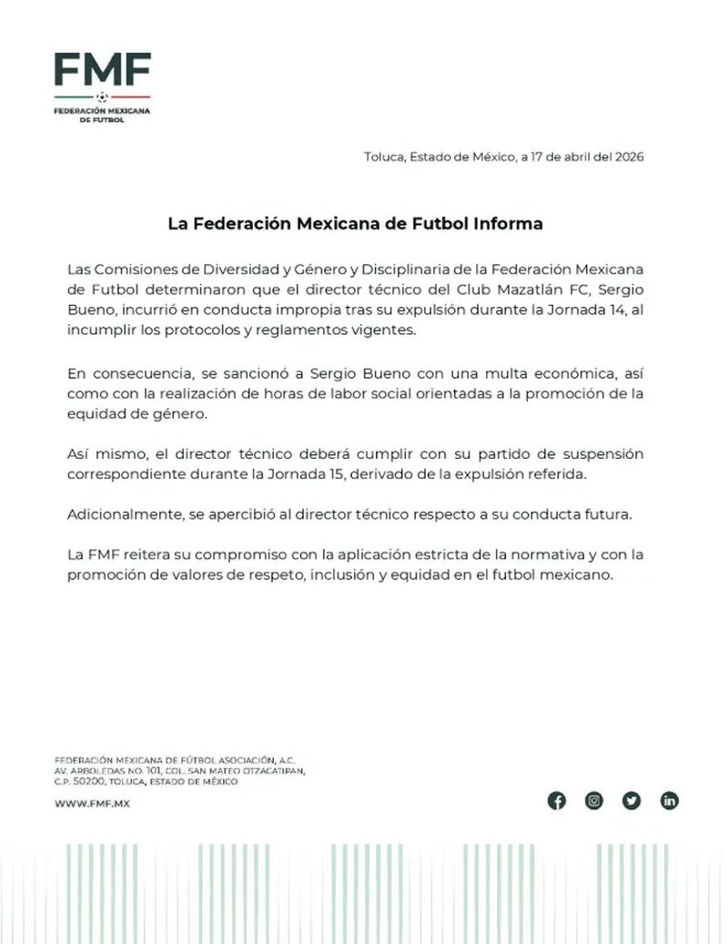 «Las Comisiones de Diversidad y Género y Disciplinaria de la Federación Mexicana de Futbol determinaron que el director técnico del Club Mazatlán FC, Sergio Bueno, incurrió en conducta impropia tras su expulsión durante la Jornada 14, al incumplir los protocolos y reglamentos vigentes», reveló la FMF mediante un comunicado.