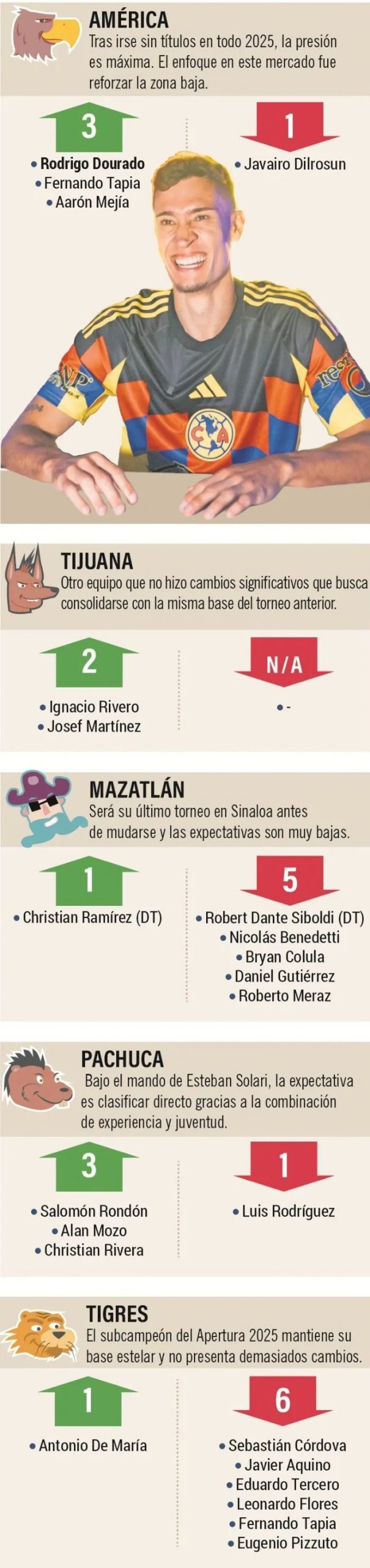 Tras un mercado de fichajes atípicamente frío, el futbol de estufa dejó apenas chispazos, como la llegada de Rodrigo Dourado al América o de Ángel Sepúlveda a Chivas, obligando a la mayoría de los clubes a apostar por la continuidad de sus proyectos.