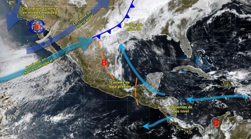 Durante las próximas 24 horas, el frente frío 39 se desplazará sobre el norte y noreste del país e interactuará con un canal de baja presión y aire húmedo proveniente del Golfo de México. Esta combinación favorecerá lluvias fuertes, tormentas eléctricas y granizadas en varias entidades del norte, mientras que en la península de Baja California una circulación ciclónica en niveles altos de la atmósfera provocará vientos intensos y lluvias aisladas, con posible nieve o aguanieve en la sierra de San Pedro Mártir.
