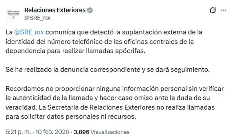 La Secretaría de Relaciones Exteriores (SRE) alertó este martes 10 de febrero sobre la detección de un intento de fraude telefónico que involucra la suplantación de su número oficial.