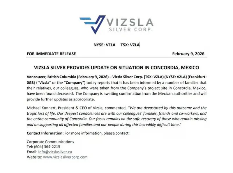 La empresa canadiense, Vizsla Silver Corp divulgo un comunicado en el que resalta estar consternado por la localización de sus colegas del proyecto minero de Concordia, sin vida, sin precisar el número de víctimas, al ser notificada la empresa por familiares, de los trabajadores fallecidos.