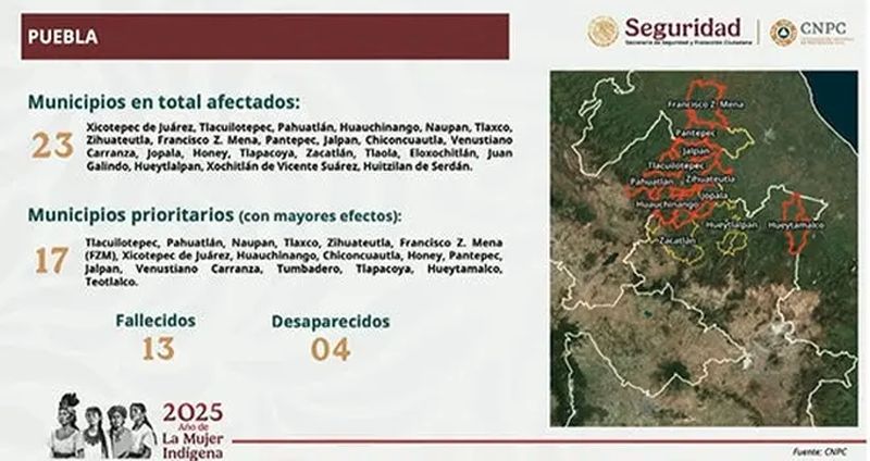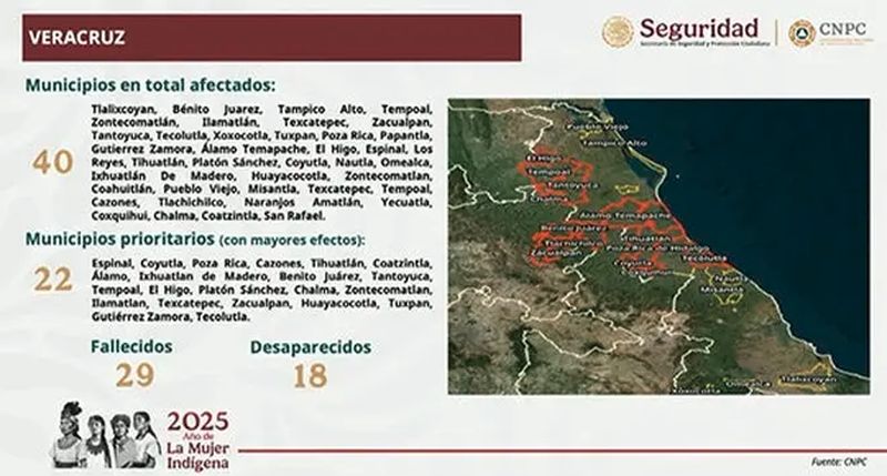 La Coordinación Nacional de Protección Civil (CNPC) señaló que los datos de las defunciones son brindados por las fiscalías locales; además indicó que las acciones de ayuda se concentran en Veracruz, Querétaro, San Luis Potosí, Puebla e Hidalgo, donde se registraron las mayores afectaciones.