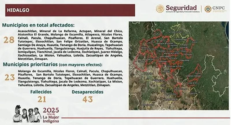 De este total, Veracruz registra 29 fallecimientos y 18 personas desaparecidas, Hidalgo suman 21 muertos y 43 desaparecidos. En el caso de Puebla 13 personas perdieron la vida sumando 4 desaparecidos y por último Querétaro reporta una persona sin vida y ningún desaparecido.