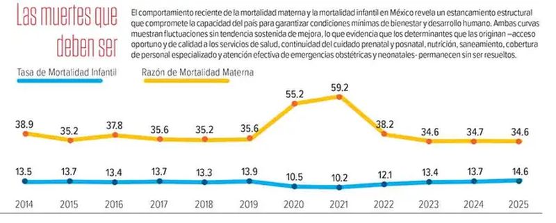 Según el informe, la tasa de mortalidad infantil fue de 13.5 decesos por cada mil niñas y niños nacidos vivos en 2014; para el año 2018 la cifra fue de 13.3; en 2021 se había logrado una reducción a 10.2. A partir de ese año se ha registrado un preocupante retroceso continuado, pues se registró una tasa de 12.1 en el 2022, de 13.4 en el 2023; de 13.7 en 2024 y de 14.6 en el 2025, es decir, la peor cifra registrada en la última década.