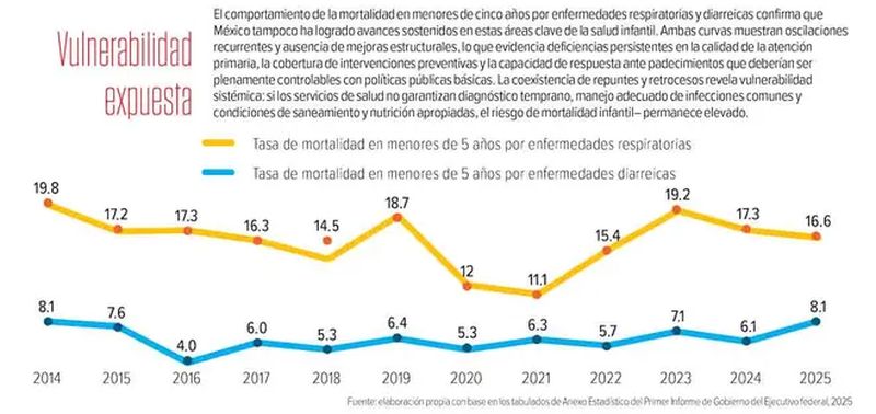 Por su parte en el caso de la mortalidad por enfermedades diarreicas, la tasa en 2014 fue de 8.1 por cada 100 mil en el grupo de edad; de 5.3 en 2018; y a partir de esa fecha el estancamiento y retrocesos son permanentes: 6.4 en 2019, 5.3 en 2020, 6.3 en 2021, 5.7 en 2022, 7.1 en 2023, 6.1 en 2024 y 8.1 en 2025, es decir, el mismo indicador que una década atrás.
