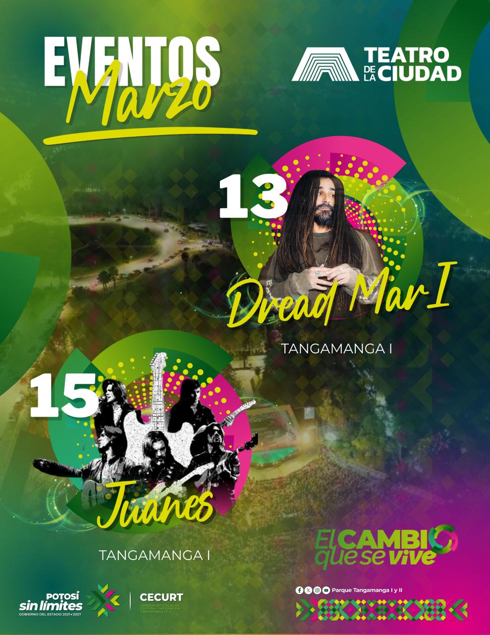 El viernes 13 de marzo se presentará el cantante Dread Mar I, referente del reggae latino, quien interpretará temas como “Tú Sin Mí”, “Hoja en Blanco” y “Nada”. Para el domingo 15 de marzo está programado el concierto del artista Juanes, reconocido a nivel internacional y ganador de múltiples premios Grammy y Latin Grammy, con éxitos como “A Dios le Pido”, “La Camisa Negra” y “Es por Ti”.