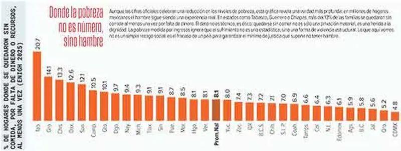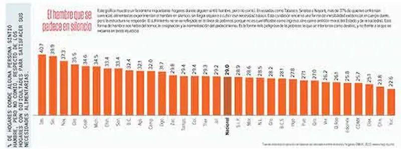 Asimismo, la ENIGH desglosa en diferentes dimensiones esa problemática. Así, de los 12.85 millones de hogares donde se experimentó la problemática señalada, en 3.72 millones “Alguna persona sintió hambre, pero no comió”, lo cual representa 29% del total de los hogares donde se tienen dificultades para satisfacer sus necesidades alimentarias. Las entidades donde se registraron los peores indicadores son: Tabasco, con 40.7%; Sinaloa, 39.9%; Nayarit, 37.3%; Guanajuato, 35.5%; Coahuila; 34.6%; Michoacán, 34.5%; Chihuahua, 33.4%; Baja California, 32.4%; Aguascalientes, 32.1%; Campeche, 32%, y Durango, 31.7%.