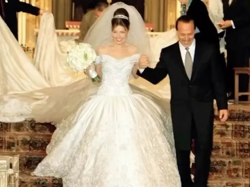 Su dimensión la convirtió en una de las colas más espectaculares vistas en una boda de celebridades. Y aunque la prenda alcanzaba los 70 kilos de peso, Thalía la lució con una naturalidad sorprendente, como si se tratara de una extensión más de su brillo personal.