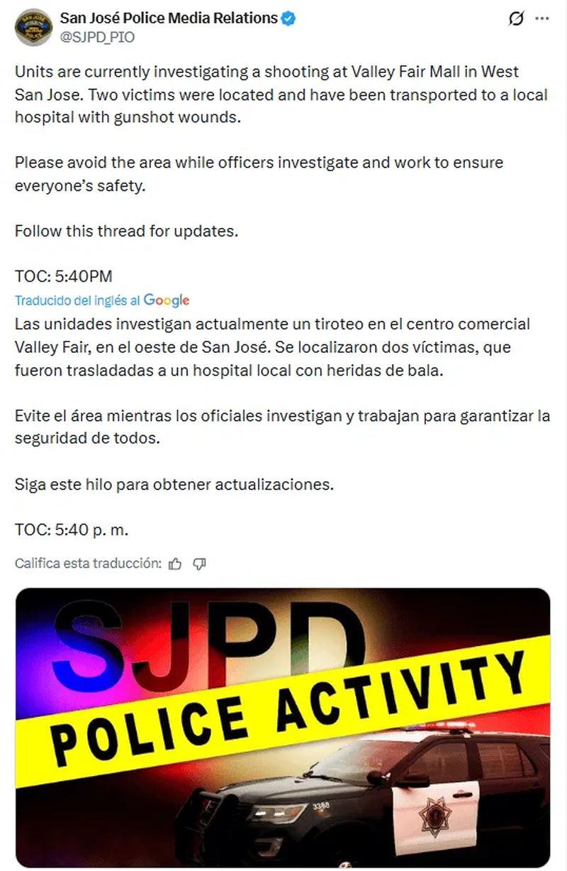 Un tiroteo registrado este viernes 28 de noviembre dejó al menos dos heridos en un centro comercial de California en pleno periodo de ofertas del Black Friday en Estados Unidos, de acuerdo con el Departamento de Policía de San José.