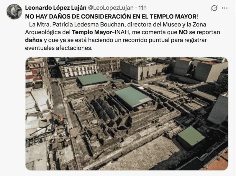 «NO HAY DAÑOS DE CONSIDERACIÓN EN EL TEMPLO MAYOR! La Mtra. Patricia Ledesma Bouchan, directora del Museo y la Zona Arqueológica del Templo Mayor-INAH, me comenta que NO se reportan daños y que ya se está haciendo un recorrido puntual para registrar eventuales afectaciones», escribió el arqueólogo en redes sociales.