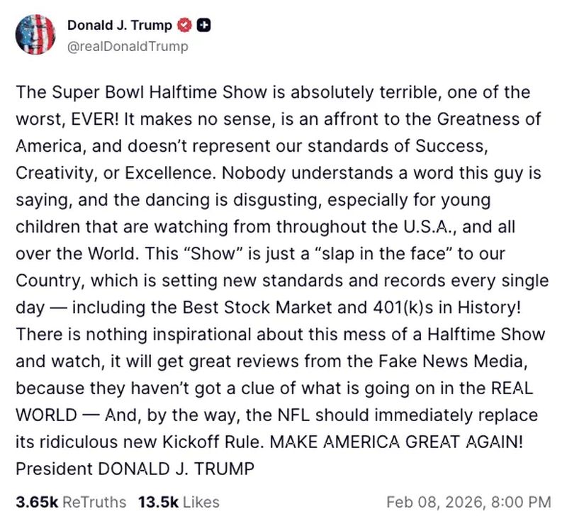 “¡El espectáculo del medio tiempo del Super Bowl es absolutamente terrible, uno de los peores de la historia!”, escribió Trump, quien además señaló que “nadie entiende una palabra de lo que dice este tipo”.