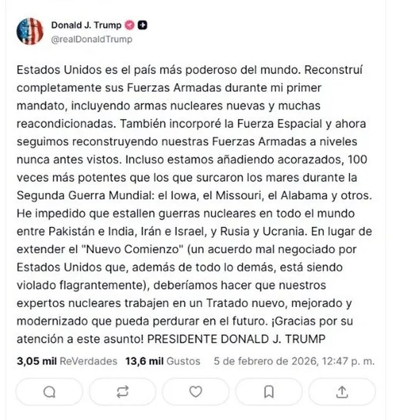 «En lugar de prorrogar el tratado ‘New START’ (un acuerdo mal negociado por Estados Unidos que, ante todo, está siendo violado flagrantemente), deberíamos encargar a nuestros expertos nucleares que trabajen en un tratado nuevo, mejorado y modernizado que pueda perdurar en el futuro», escribió Trump.