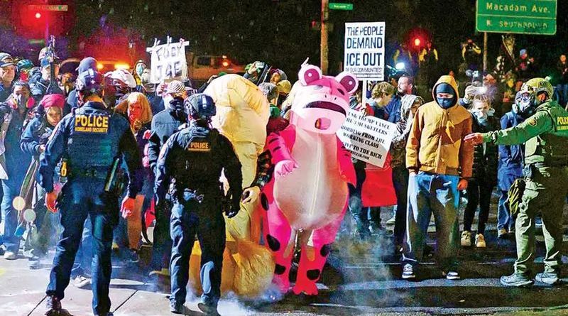 Dado el conocido gusto de los manifestantes de Portland por usar disfraces de gallina, trajes inflables de rana o incluso nada en absoluto al expresar su desacuerdo con los métodos empleados por ICE (la policía migratoria). Los observadores podrían sentirse tentados a considerar la decisión de la mayoría, que acepta la caracterización del gobierno de Portland como una zona de guerra, como simplemente absurda”, expuso Graber.