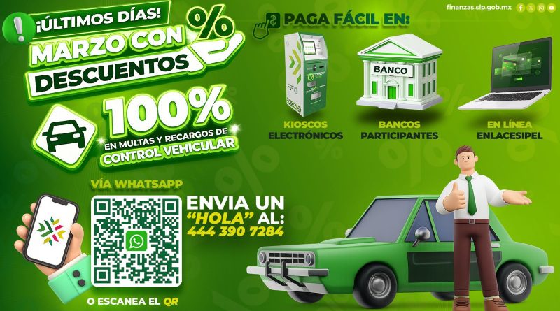 Como parte del compromiso del Gobernador Ricardo Gallardo Cardona con la economía familiar, la Secretaría de Finanzas (Sefin) informó que se encuentra en la etapa final el programa de descuentos del 100 por ciento en multas y recargos del control vehicular. La titular de la dependencia, Ariana García Vidal, informó que este apoyo sin límites estará vigente únicamente hasta el 30 de marzo, por lo que se invita a la ciudadanía a aprovecharlo antes de que concluya el plazo.