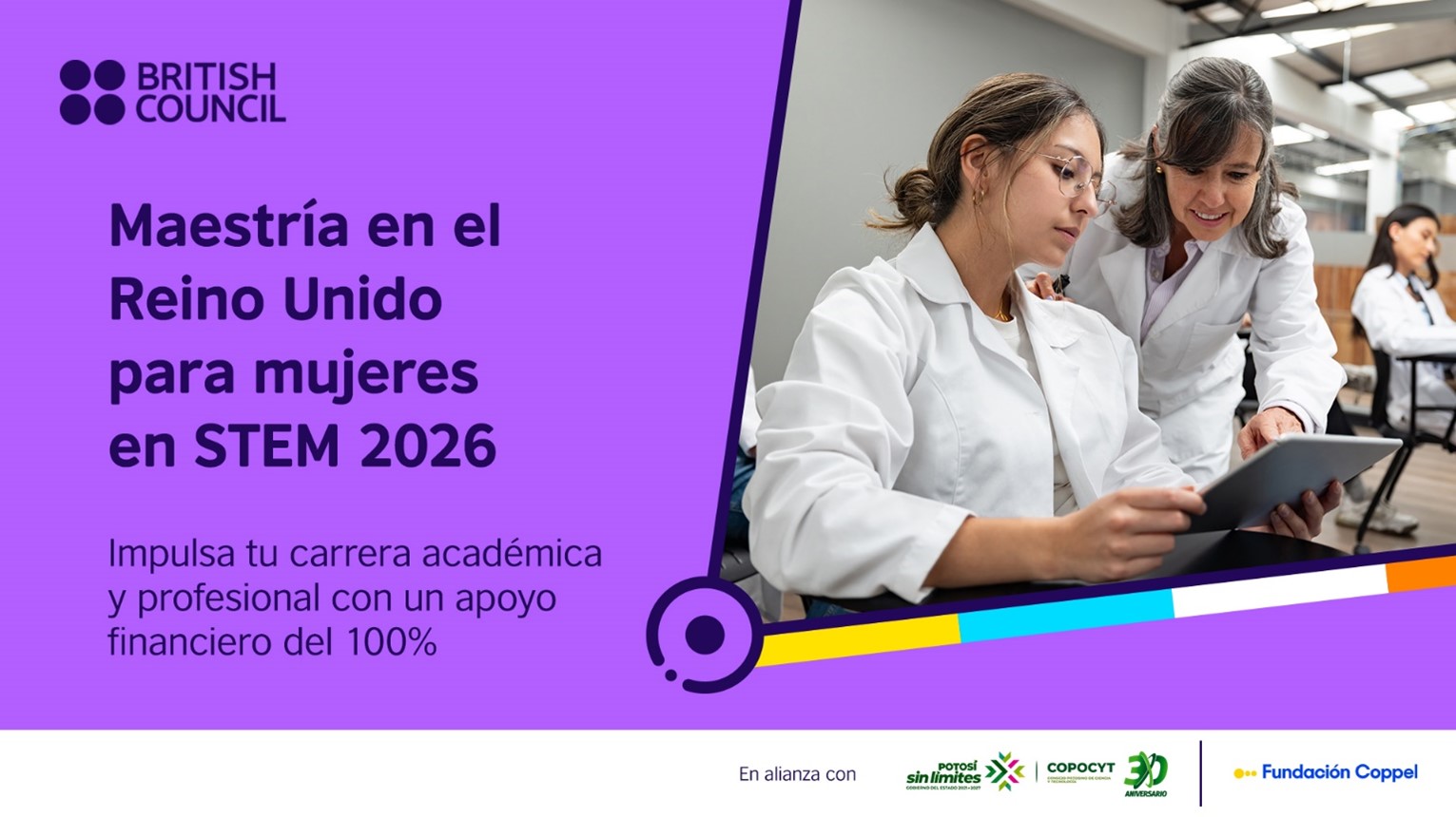 Como parte del cambio que se vive y se siente en la ciencia, la tecnología y la investigación, el British Council y el Gobierno del Estado de San Luis Potosí, encabezado por Ricardo Gallardo Cardona, a través del Consejo Potosino de Ciencia y Tecnología (Copocyt), anunciaron la apertura de la convocatoria del programa Women in STEM 2026, que ofrece apoyo financiero del 100 por ciento para cursar posgrados en Cardiff University o en University of Essex, ubicadas en Reino Unido.