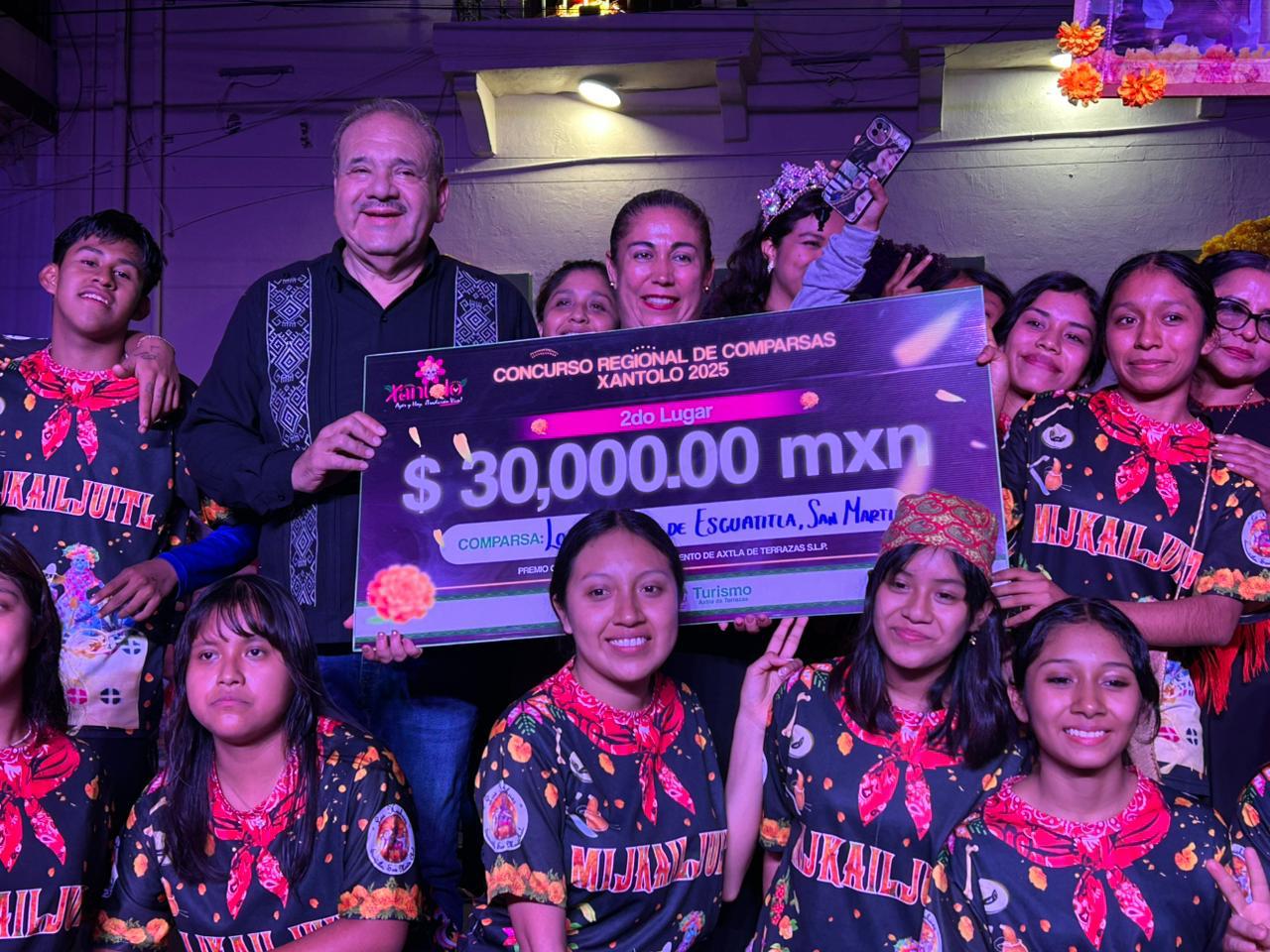 El espíritu festivo se trasladó a Axtla de Terrazas, donde el Concurso Regional de Comparsas 2025 llenó el municipio de creatividad y pasión. La comparsa Xocopaltic de Axtla obtuvo el primer lugar, seguida por Los Huehues de Escuatitla y La Tradicional de Matlapa. Además, el panteón de Cuayo, Chalco, fue escenario del cambio de fiscal de cuatro barrios y la velación nocturna, con velas, música y pirotecnia que hicieron de este un momento profundamente emotivo, en el que se rinde tributo a quienes partieron.